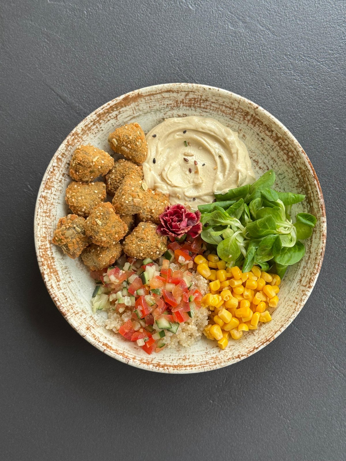 Hrskavi i blago pikantni falafel, humus, salata i kukuruz.
