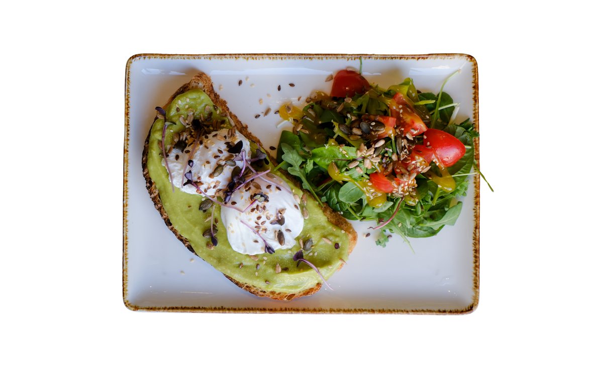 Tostiran hleb na maslinovom ulju, premazan avokado kremom sa 2. poširana jajeta, feta sirom i susamom
