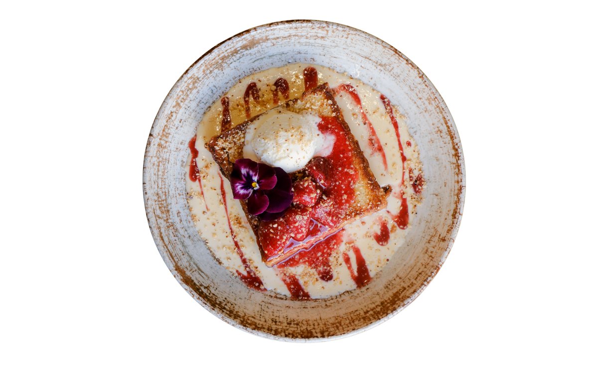 Hrskavi brioš hleb u vanil kremu sa šumskim voćem i sladoledom od vanile.