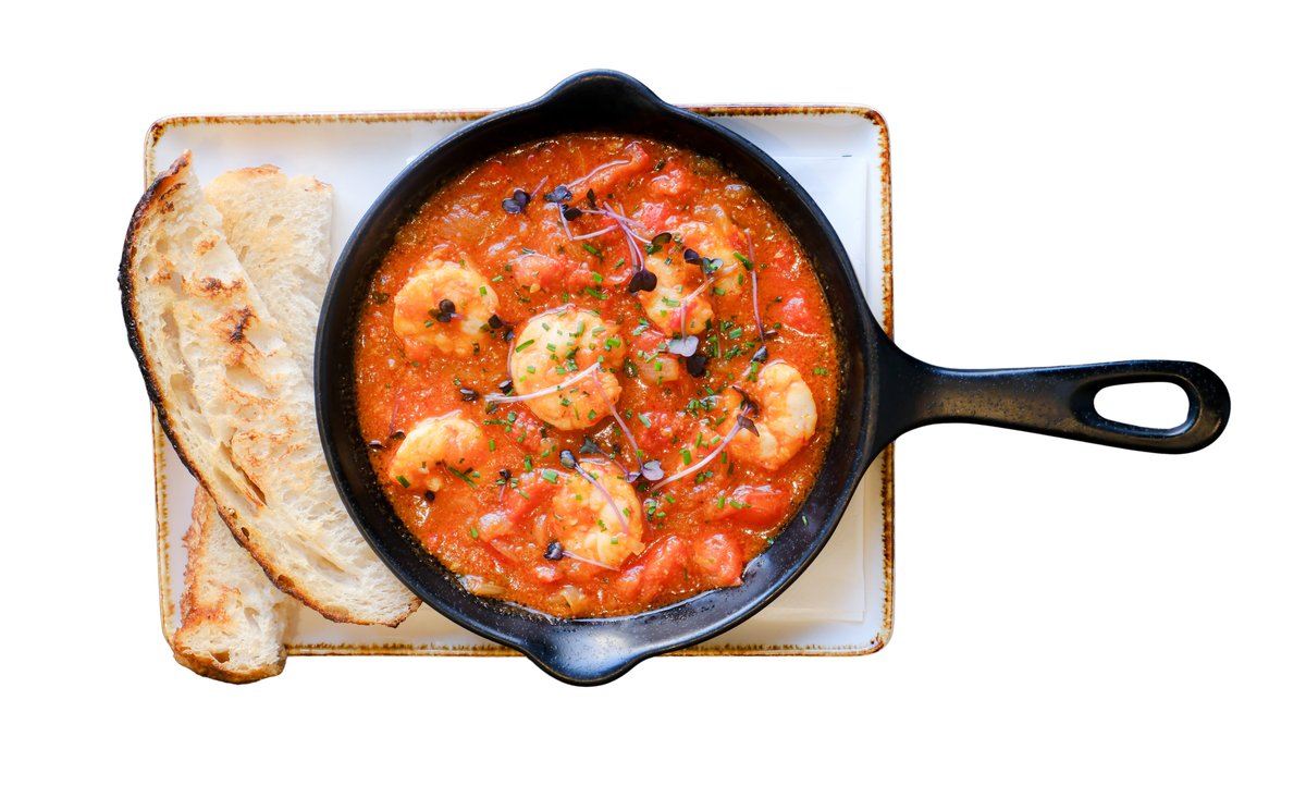 Gambori u crvenom sosu od šakšuke i hrskavi hleb.