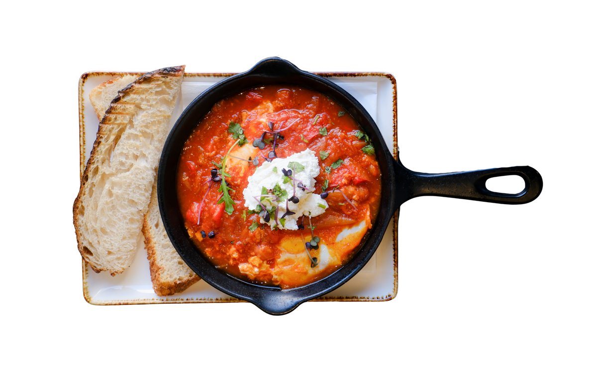 Dugo kuvana paprika, paradajz i luk sa dodatkom začina, dva zapečena jajа, feta sir i hrskavi hleb.