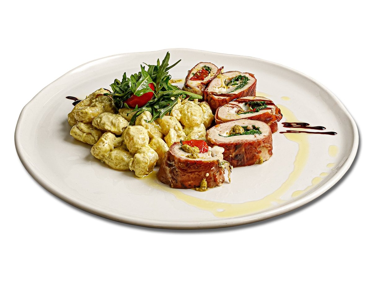 Piletina punjena mozzarellom, rukolom i cherry paradajzom rolovana u pršuti sa domaćim njokama u pesto sosu