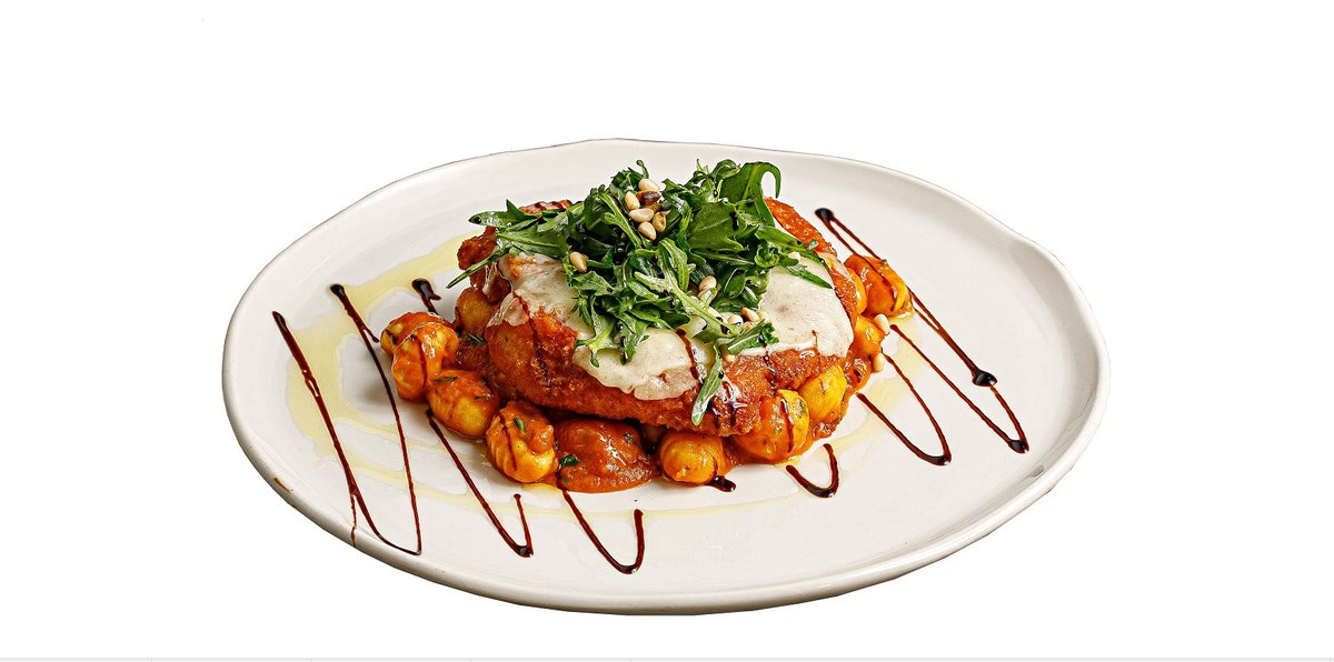 Pohovana piletina sa parmezanom i kačkavaljem u paradajz sosu na domaćim njokama