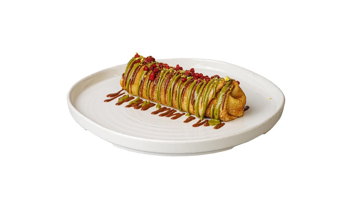 Mousse od pistaća punjen svežim malinama i hrskavim pistać kremom