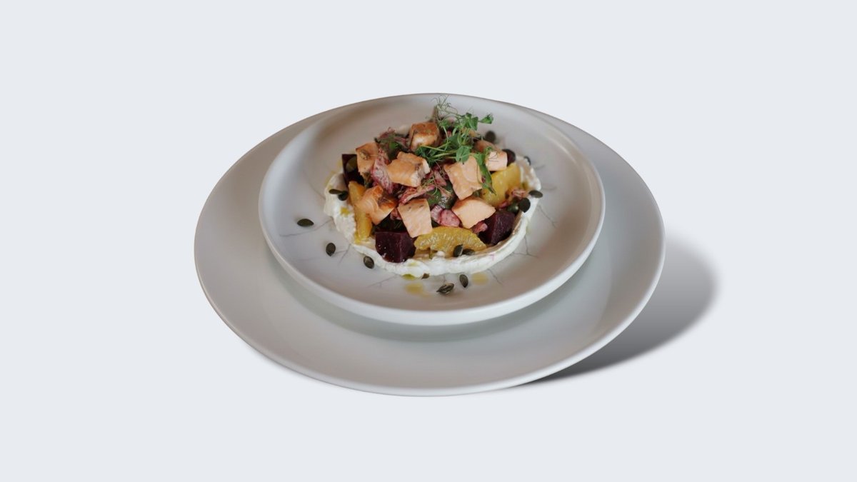 pečeni losos, cvekla i miks svežih salata posluženi sa kremastim dresingom od cvekle i krem sirom
