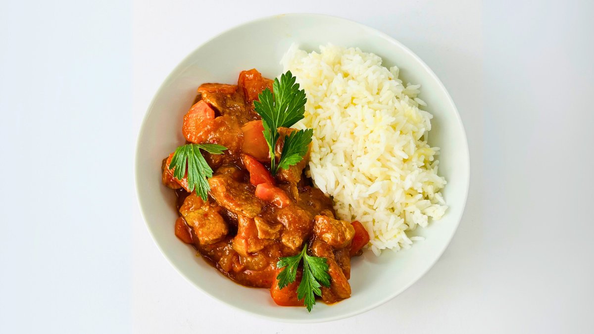 450 gr, srednje ljuto (medium spicy) batak bez kosti, suncokretovo ulje, pavlaka 20%, jasmin pirinač, đumbir, beli luk, crni luk, pasirani paradajz, garam masala, kari, kurkuma, koncentrat paradajza, limunov sok, šećer, crvena kari pasta boneless chicken thigh, sunflower oil, 20% cream, jasmine rice, ginger, garlic, onion, crushed tomatoes, garam masala, curry, turmeric, tomato paste, lemon juice, sugar, red curry paste