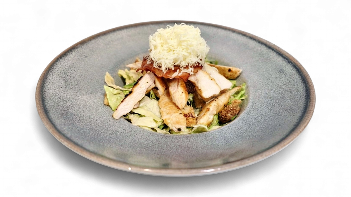 Zelezna salata, krutoni, pileći file, slanina, sir,dresing