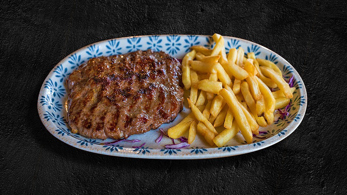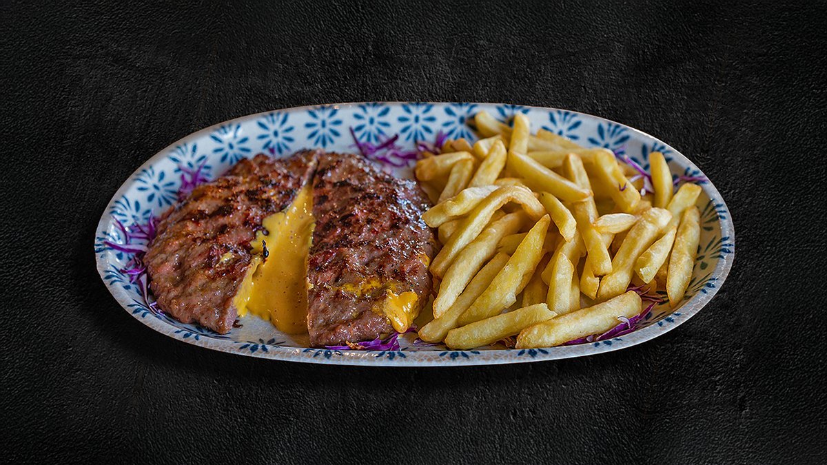 300g junećeg mesa, sir čedar, pomfrit, somun