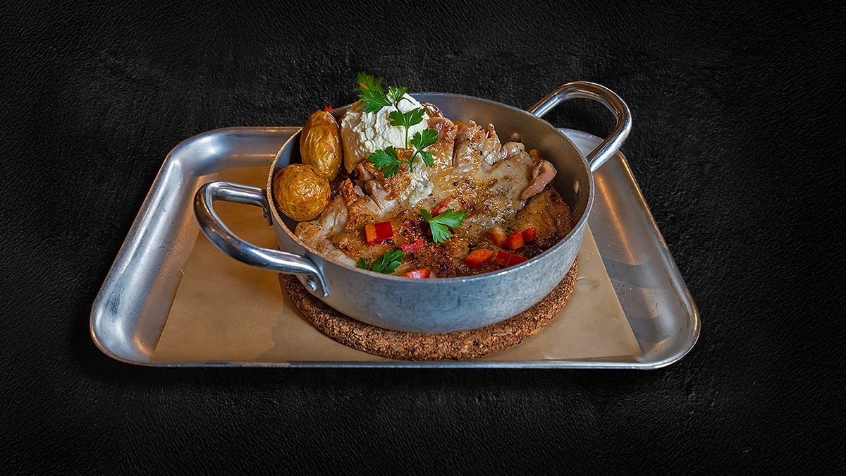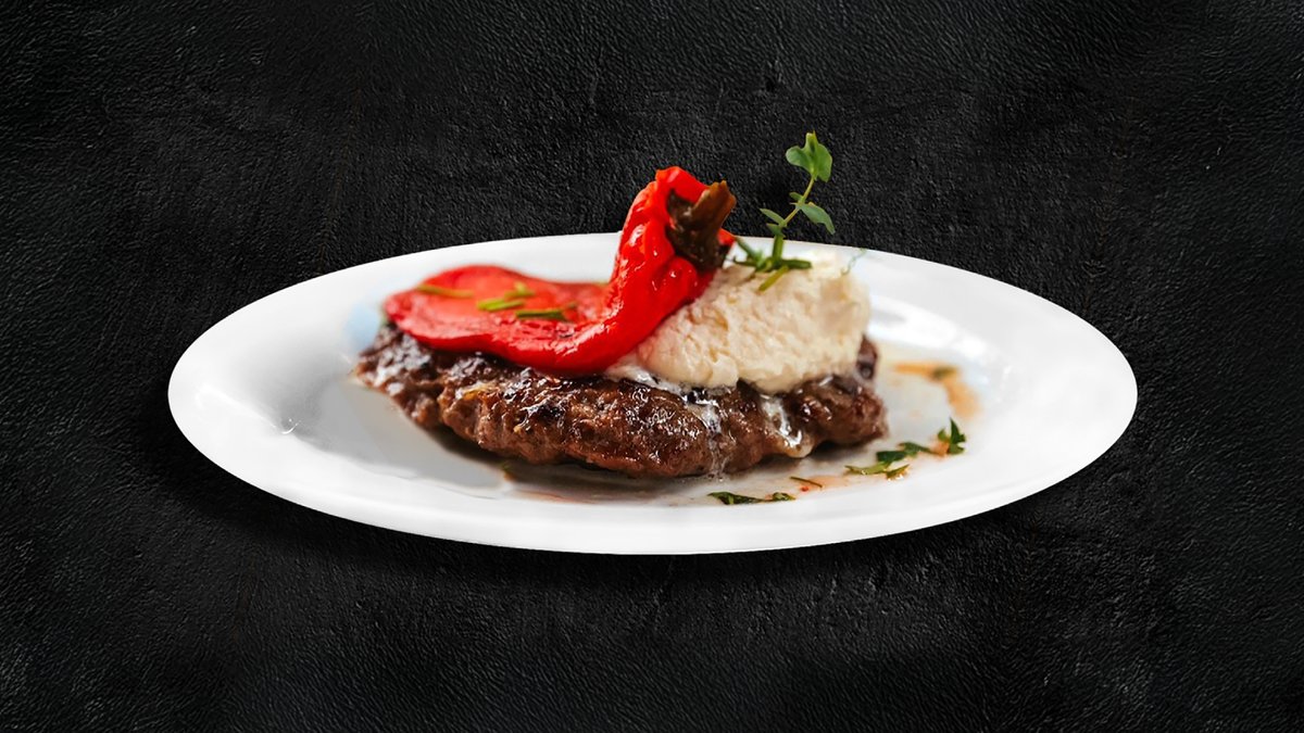 Juneće meso, kajmak, pečena paprika, pomfrit, somun
