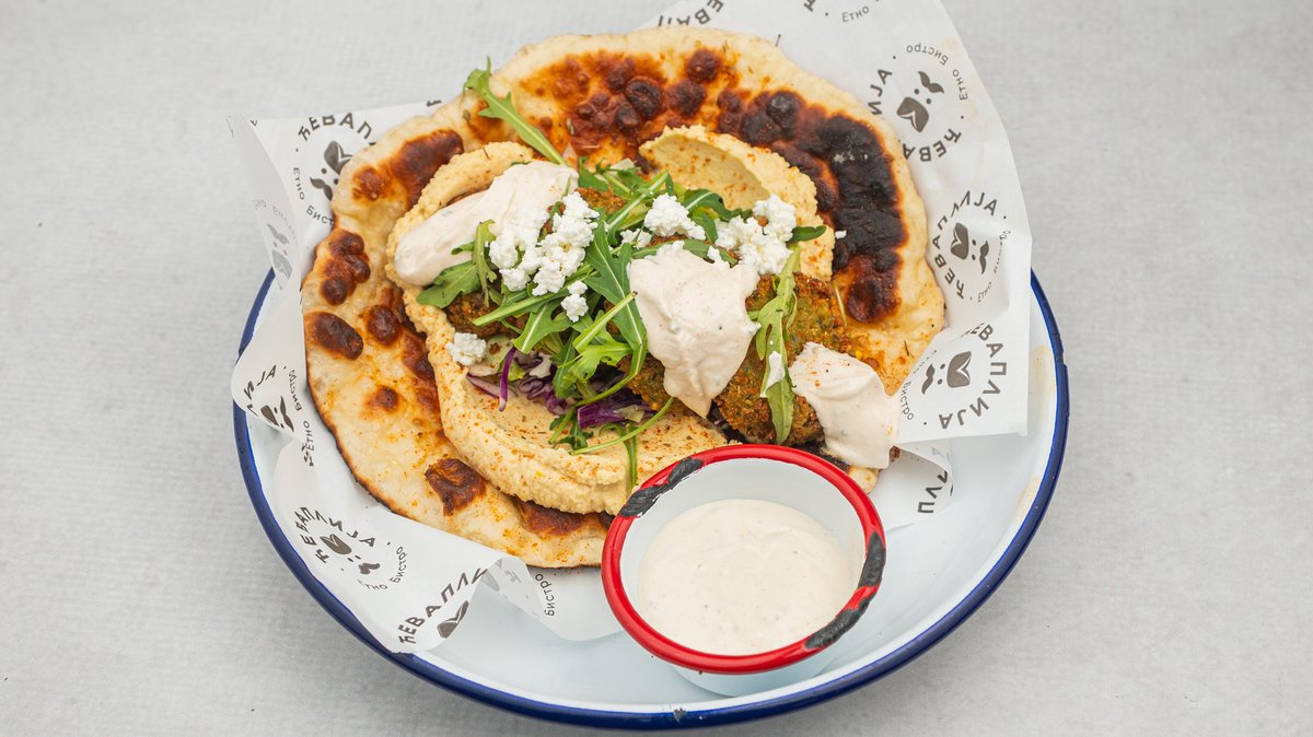 sa svežim povrćem, sa prelivom od belog luka, tahini paste i pavlake, na somunu, nanino čedo