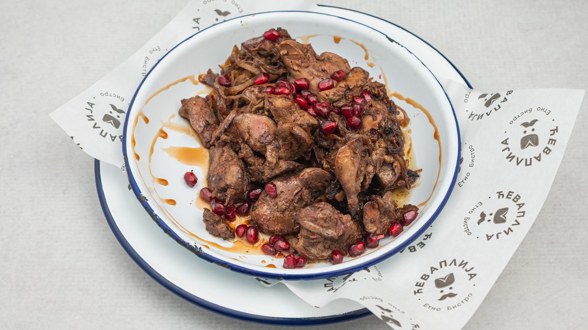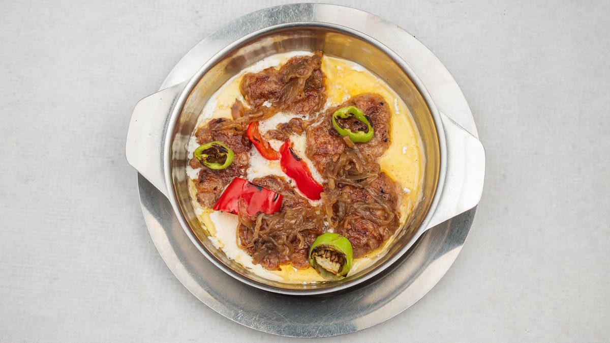 Mešano ćevap meso, karamelizovani luk, luk, kajmak, somun