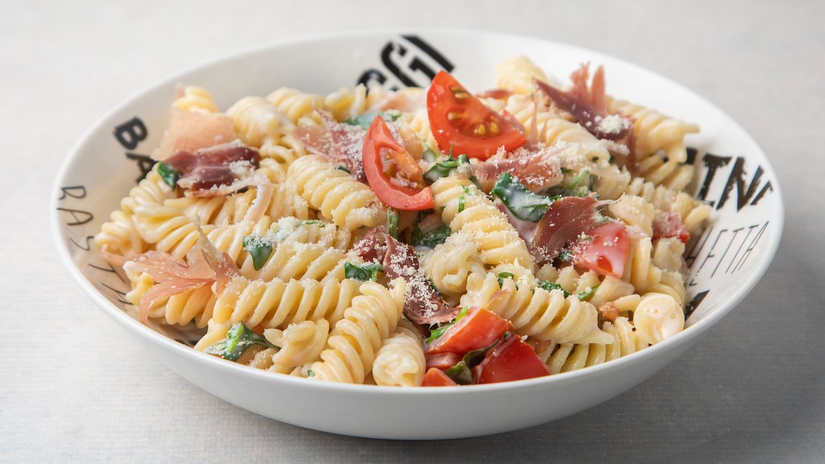 Pršuta, čeri paradajz, rukola, neutralna pavlaka, maslinovo ulje, parmezan