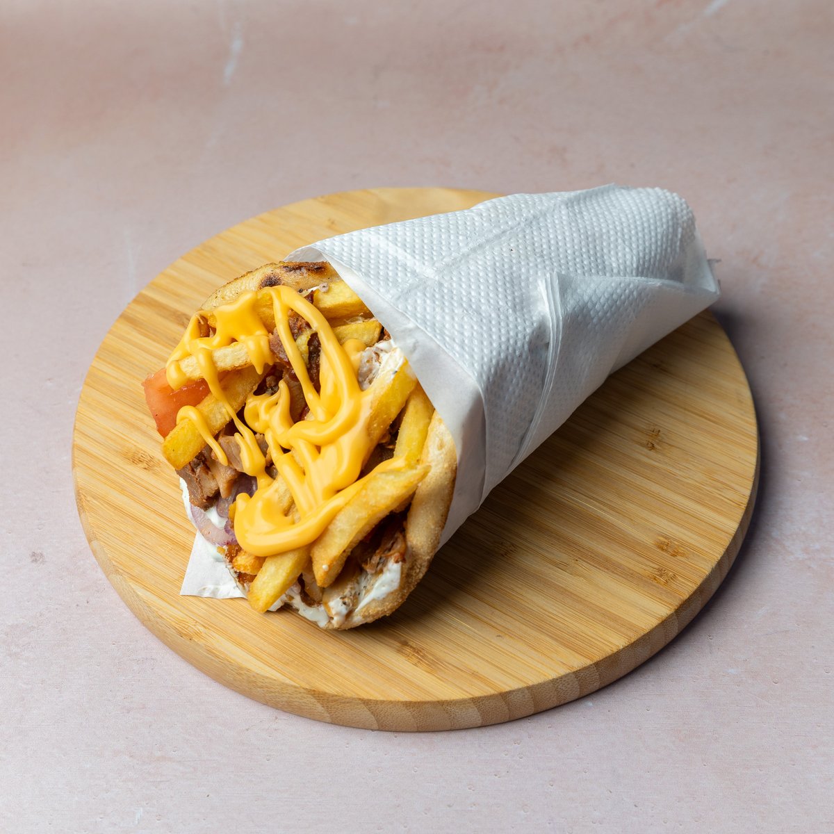 Velik Cedar Giros - Savršena kombinacija 150gr giros mesa, hrskavog pomfrita i fine pite. Dolazi sa 3 besplatna priloga po izboru, sa prelivom od cedar sira.