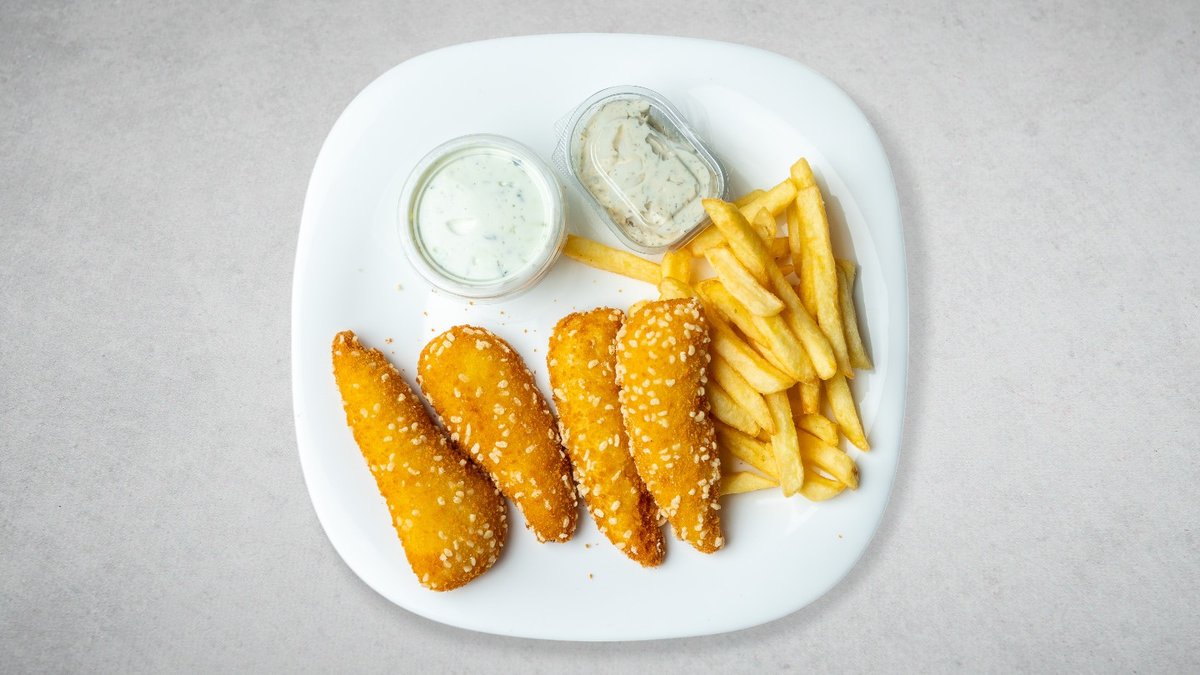 Hrskavi pileći štapići u susamu, pohovani kackavalj, nuggets, pomfrit , dva sosa po izboru
