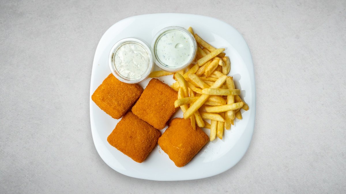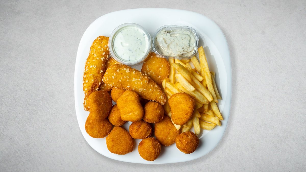 Hrskavi pileći štapići u susamu, nuggets, pohovani kackavalj,pomfrit četiri sosa po izboru,