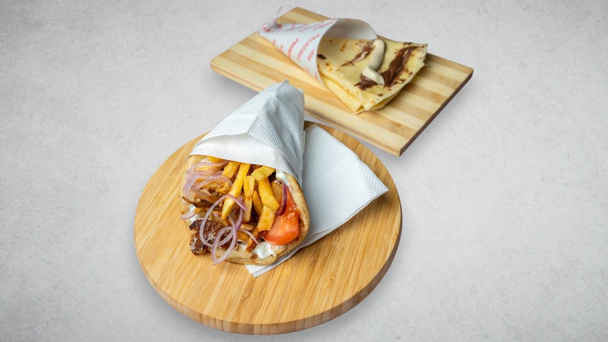 Uživajte u mega girosu s 170gr mesa, pomfritom, pitom i svim prilozima, a za slatki završetak tu je palačinka sa Eurokremom.