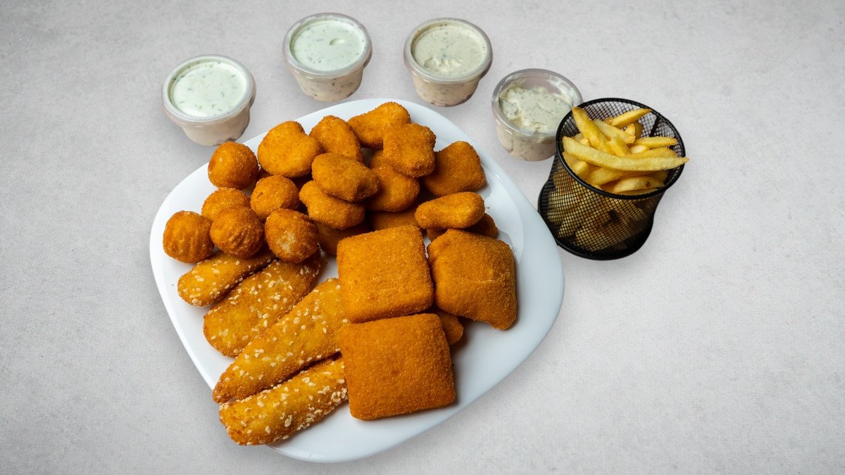 Kombinacija za dvoje - hrskavi pileći štapići u susamu, pohovani kackavalj, nuggets, pomfrit i 2 sosa po izboru.