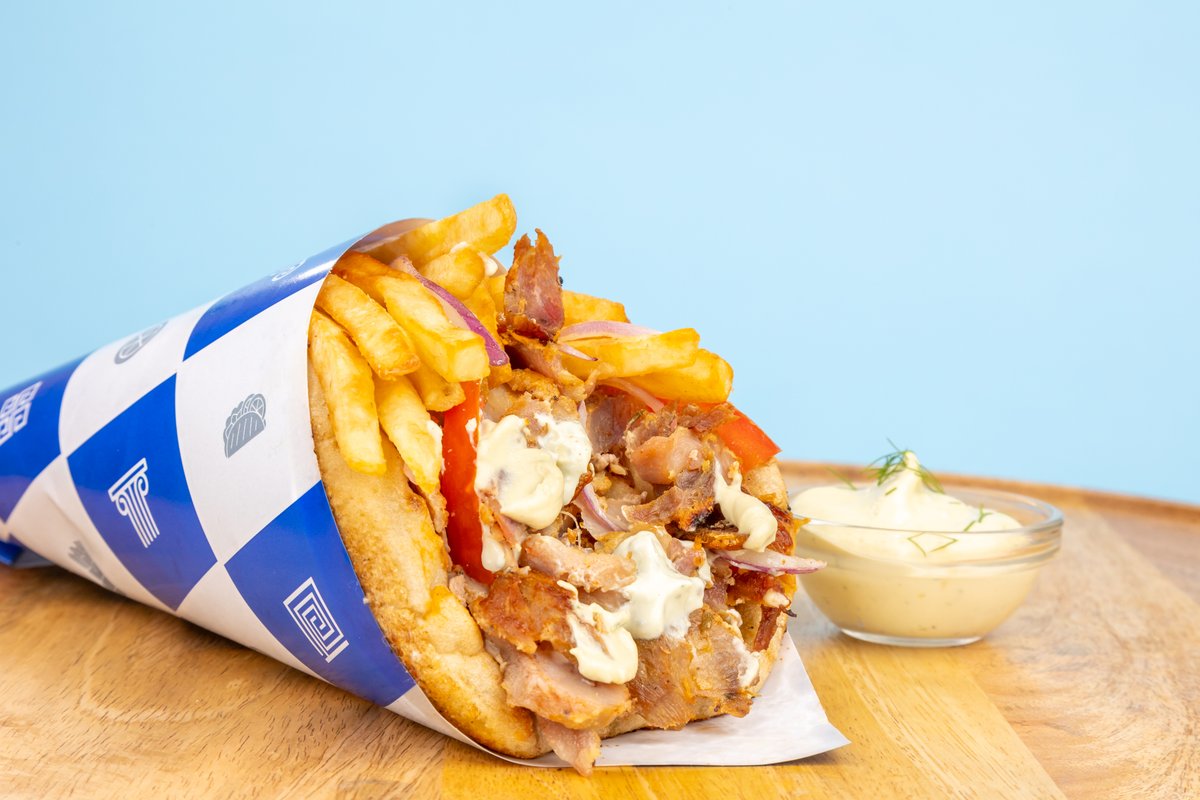 Grčka pita, pileće meso, tzatziki sos, paradajz, luk, pomfrit