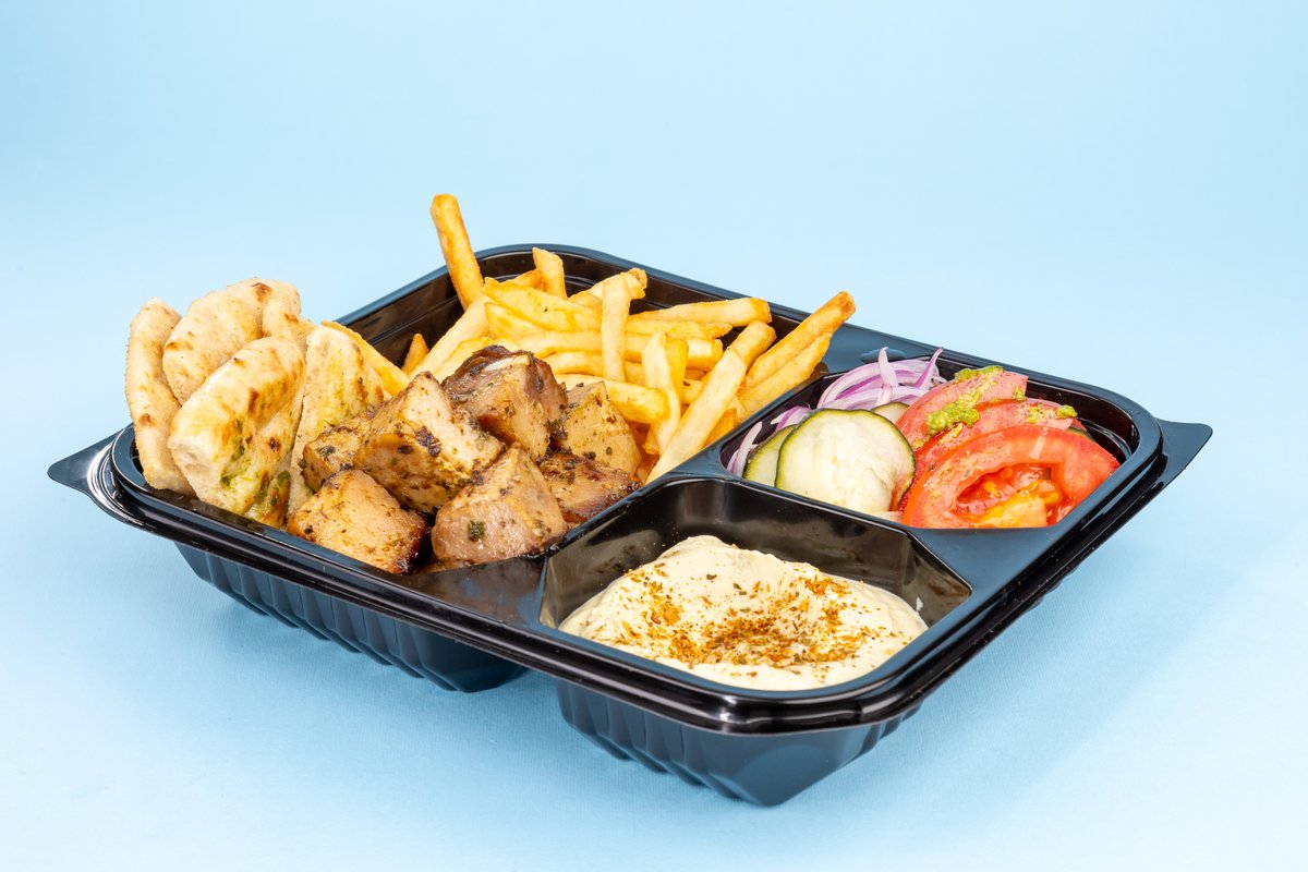 Grčka pita, pileće meso, humus sos, paradajz, luk, domaći ukiseljeni krastavac, pomfrit