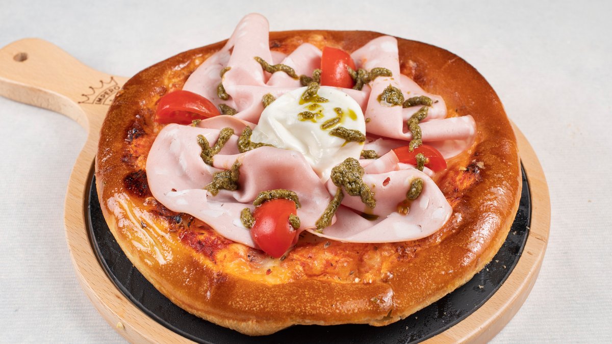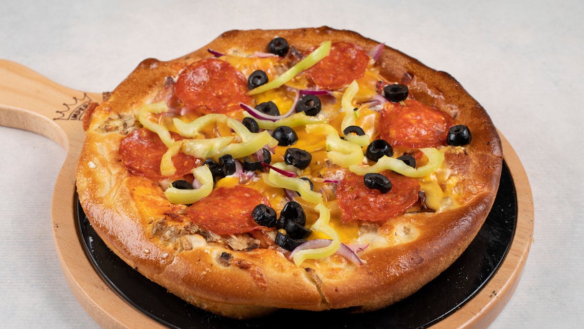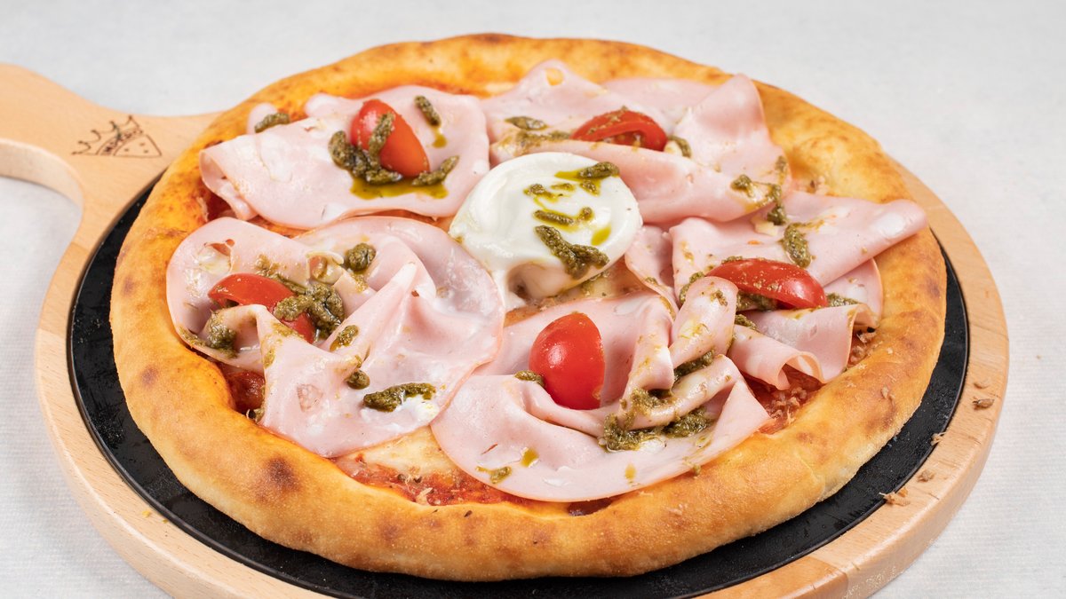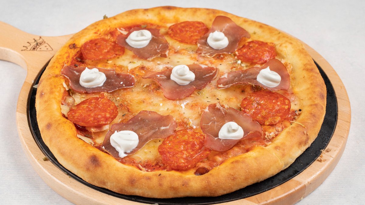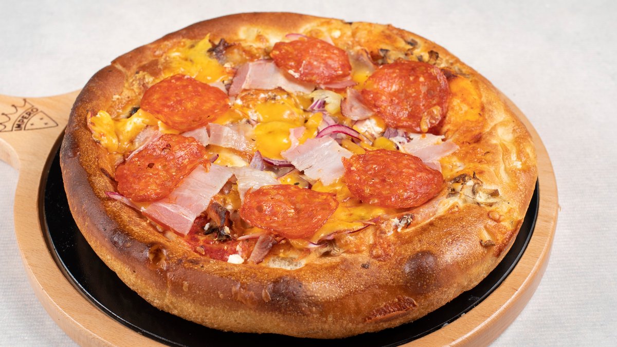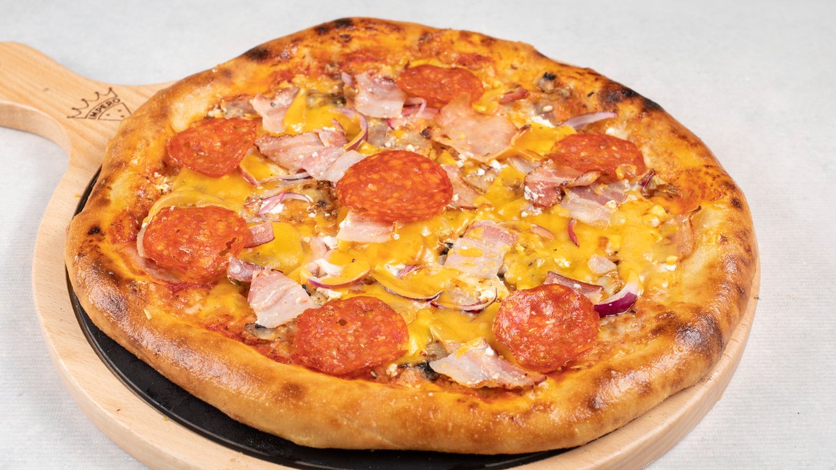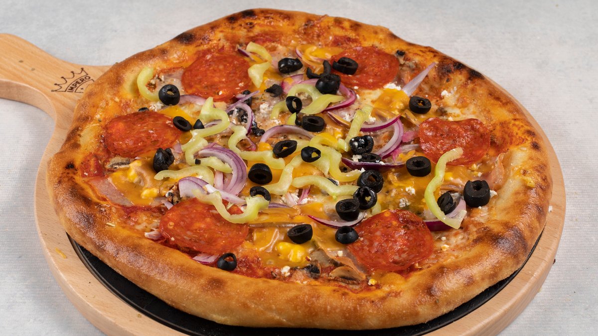 pelat, mozzarella, šunka, šampinjoni, paprika, luk, kulen, masline, čedar
