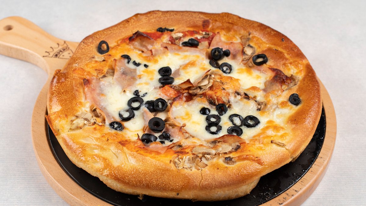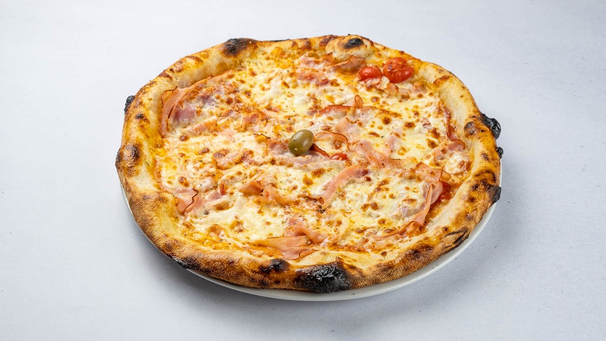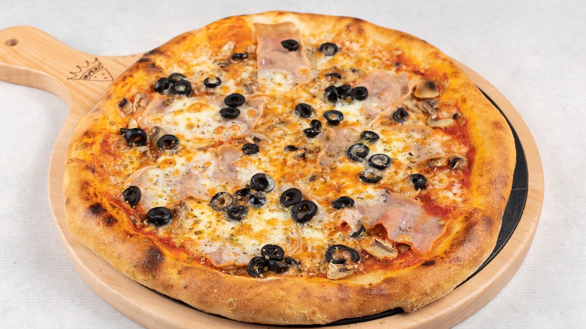 pelat, mozzarella, šunka, šampinjoni, masline