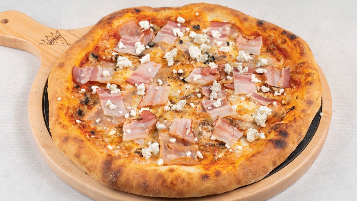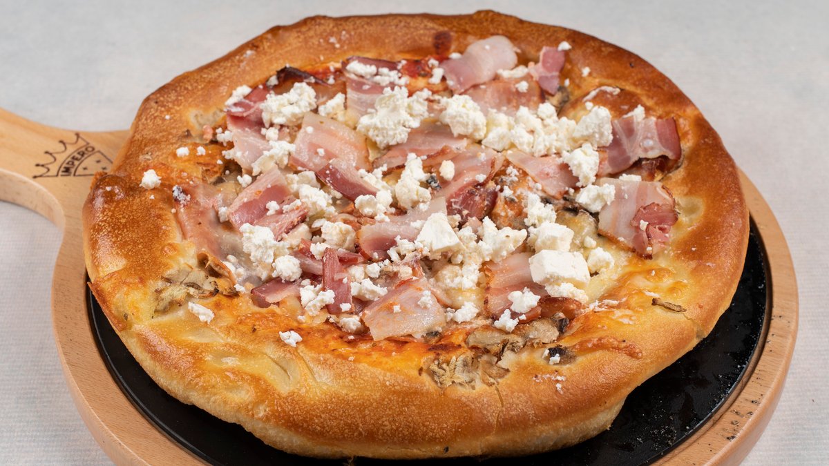 pelat, mozzarella, šunka, šampinjoni, dimljena slanina, feta
