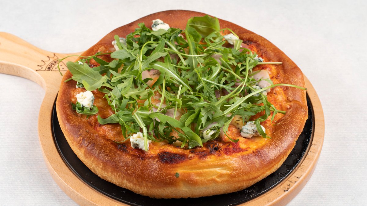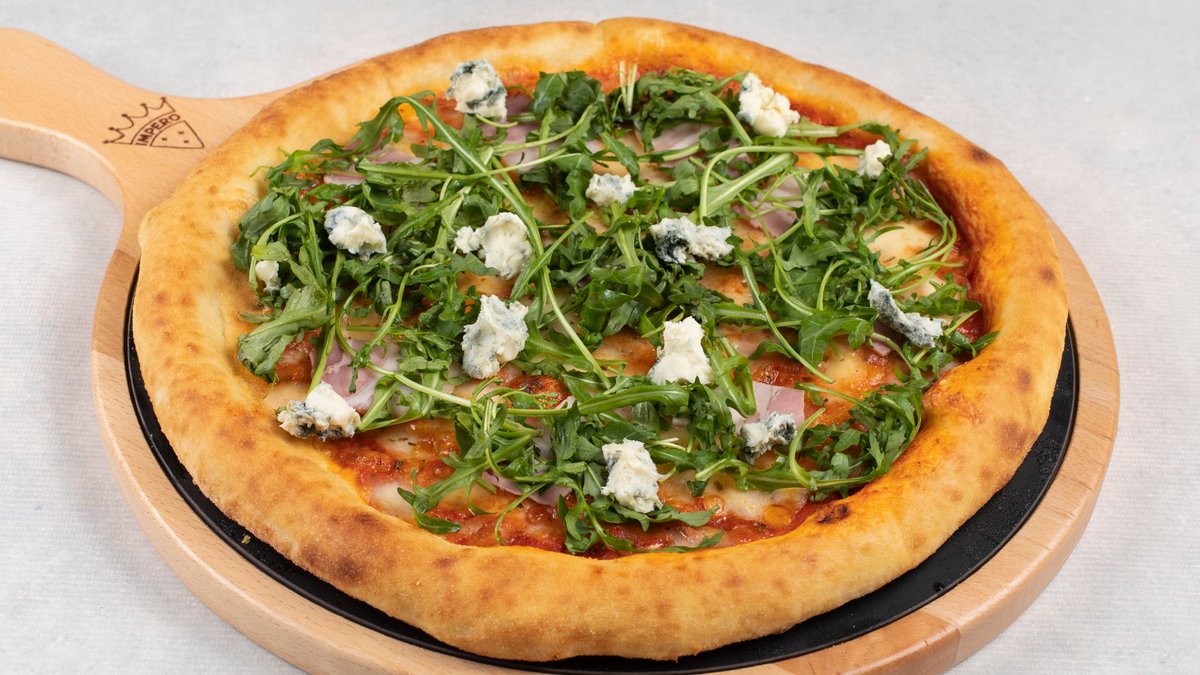 pelat, mozzarella, dimljena slanina, šampinjoni, gorgonzola, rukola