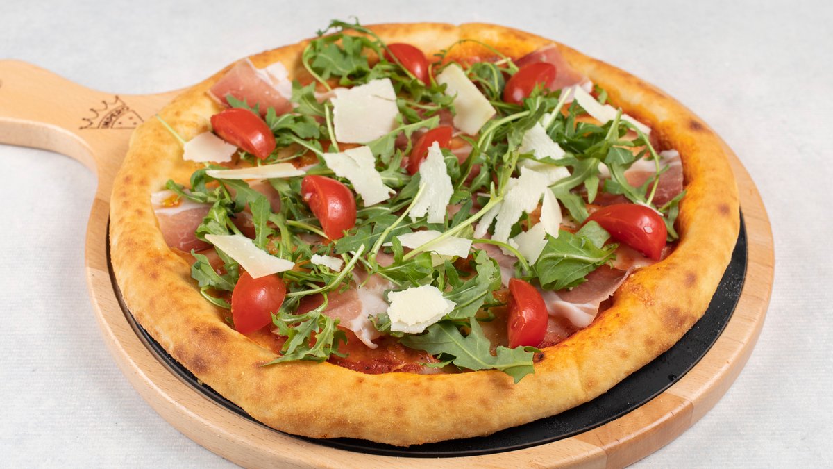 pelat, mozzarella, pršuta, rukola, parmezan, čeri paradajz