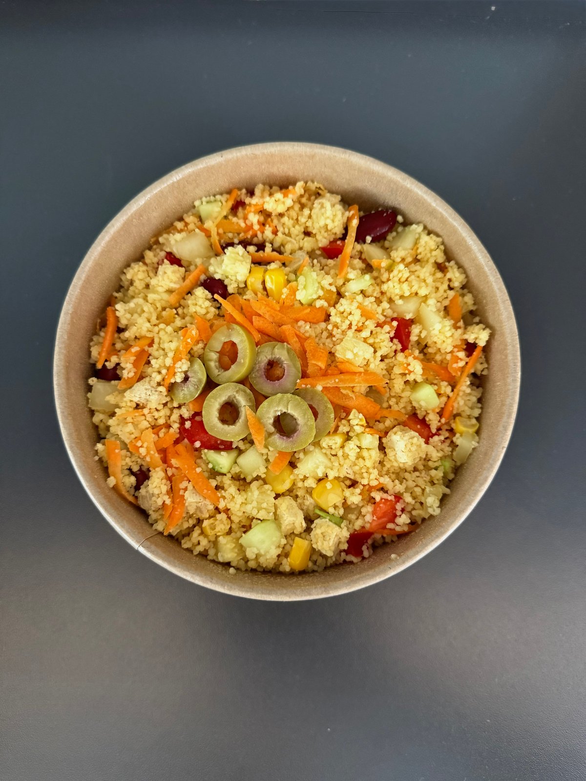 133kcal/100g Sastojci: Tofu sir, crvena i zelena paprika, kuluruz šećerac, crveni pasulj, tikvice, kus kus, masline. Prelivi: preliv od indijskog oraha, senf-med preliv