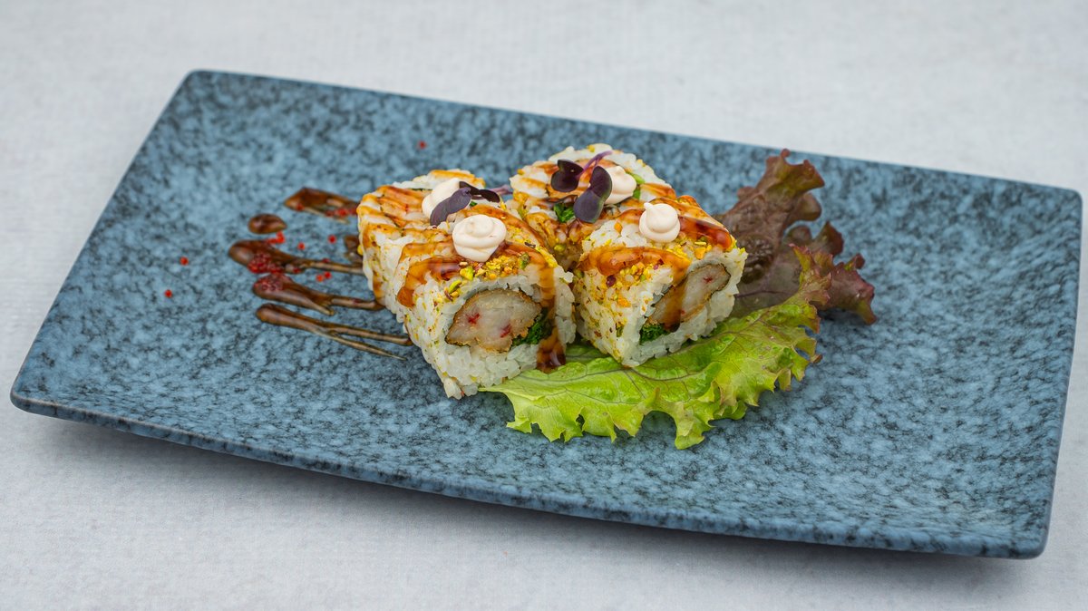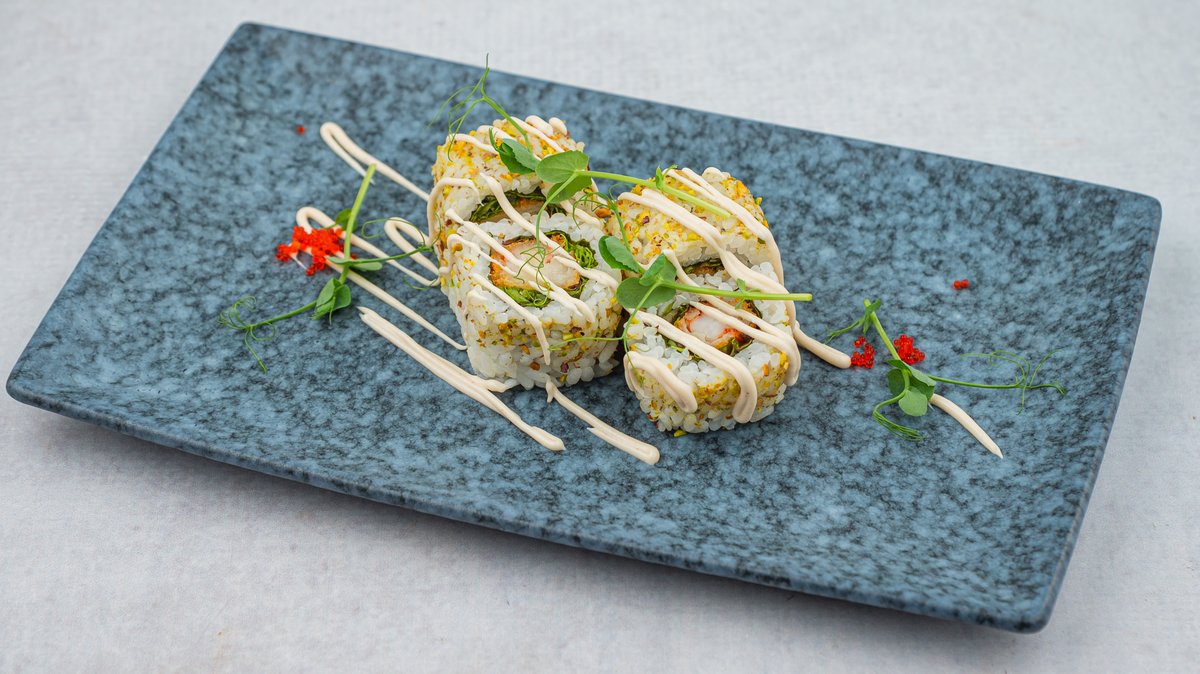 tempura gambori, tobiko, mladi luk, krastavac, paprika, tonkacu majonez, 10 komada. Napomena: sve futomaki rolnice mogu biti u tempuri sa dodatkom terijaki sosa