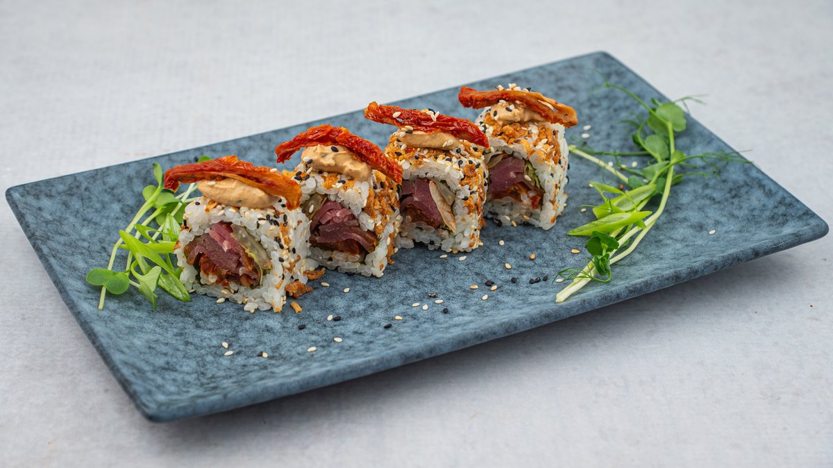 crni i beli susam, hrskavi luk, ajzberg, dimljena tuna, sušeni paradajz, dok sos, 10 komada