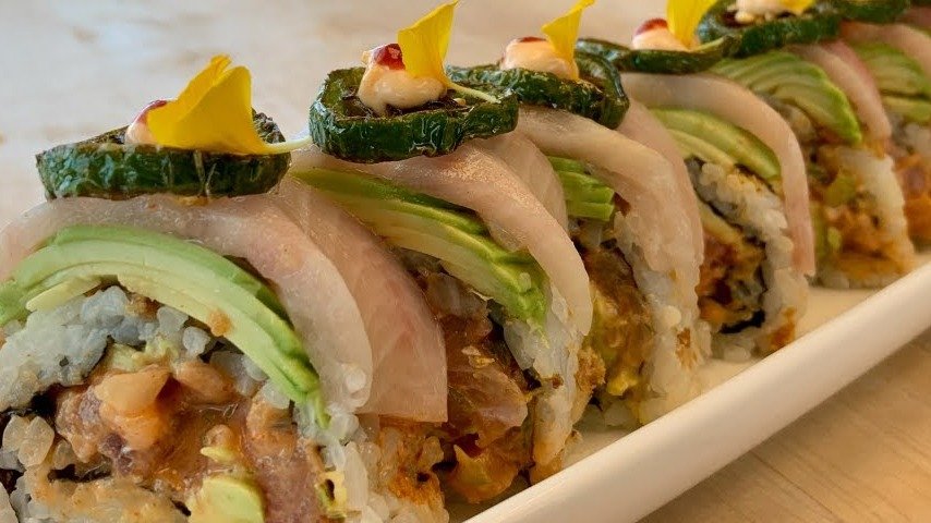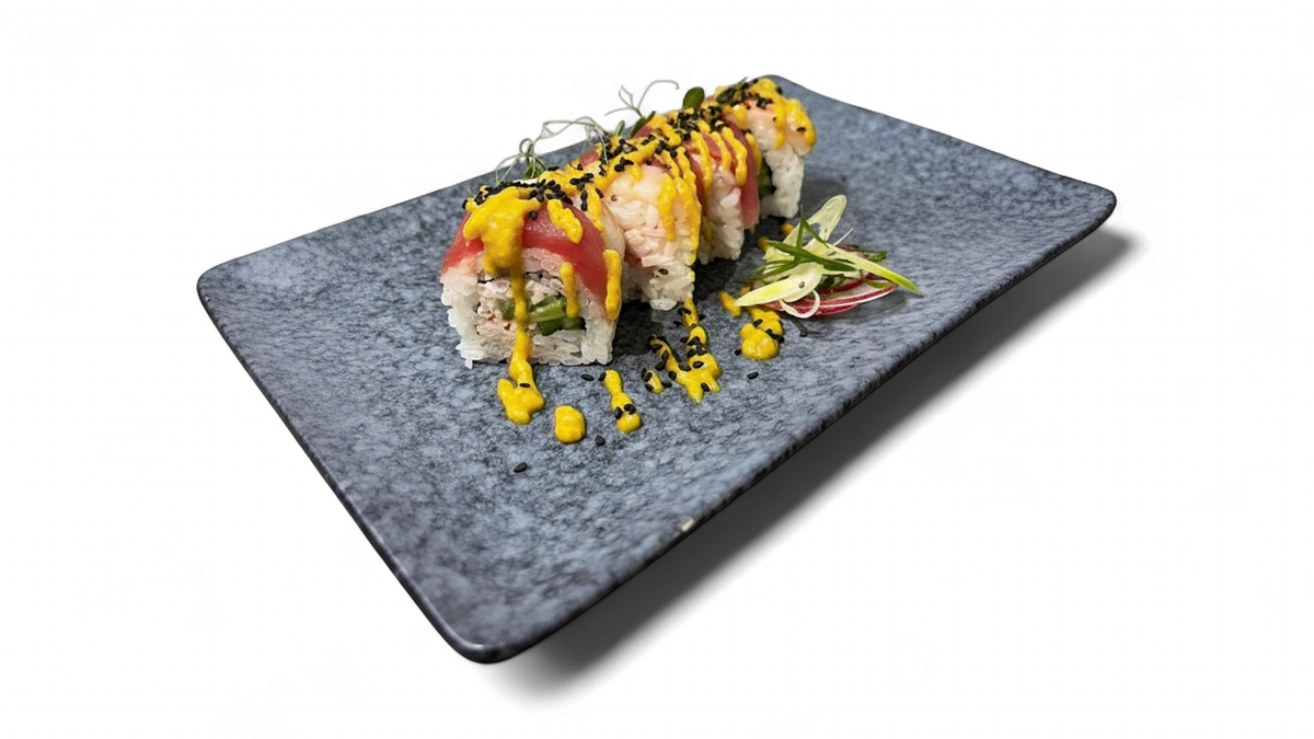 tuna, ebi, krastavac, surimi miks, avokado, kari kokos sos..
