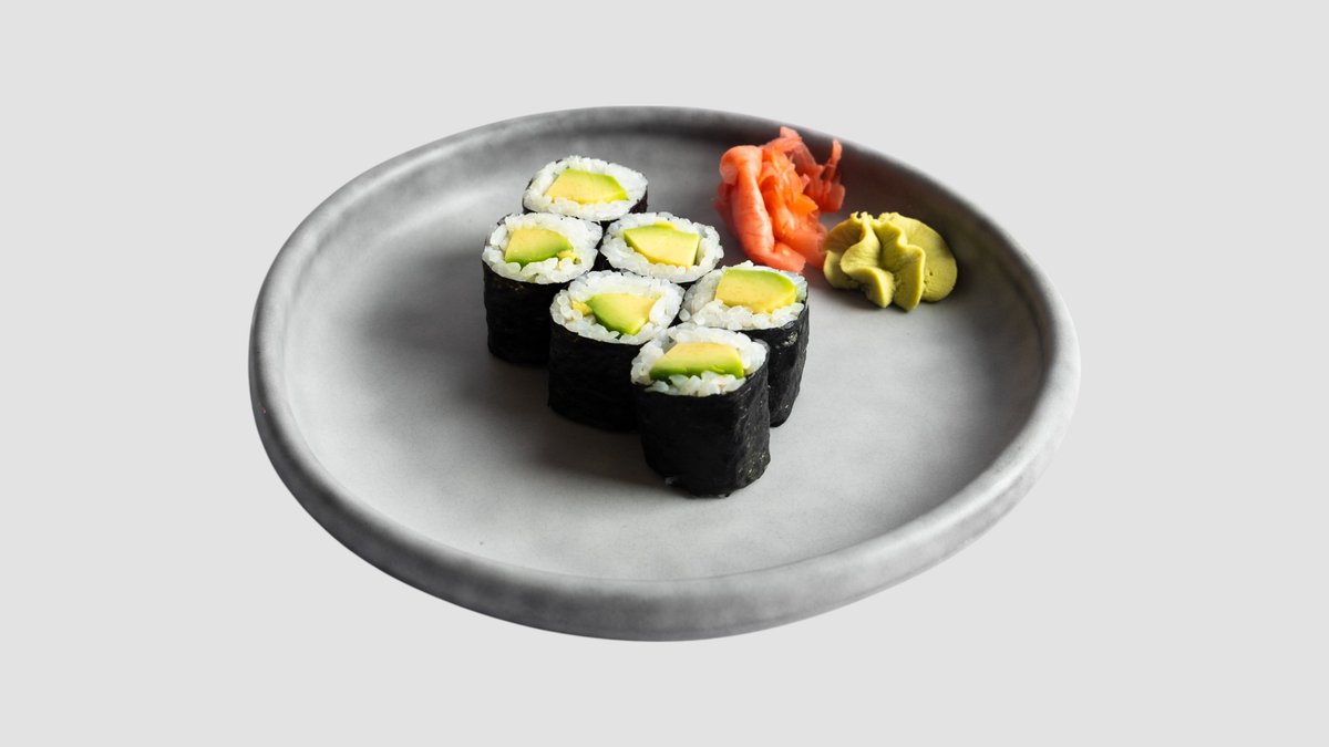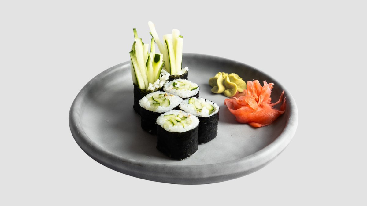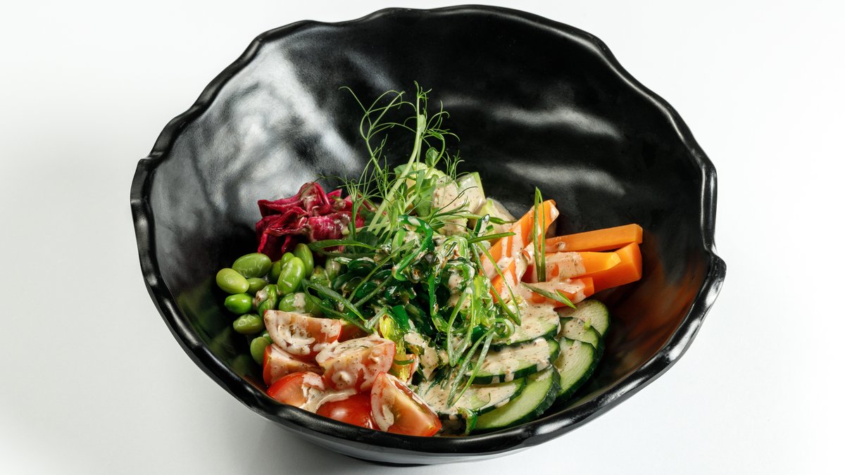 Cucumber, avocado, cabbage, chuka, green onion, carrots, cherry tomatoes, edamame
