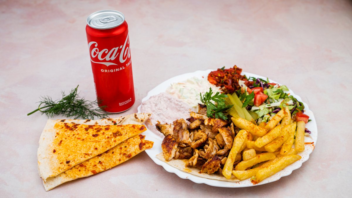 Pileća shawarma 150g, mix salata, pomfrit, beli sos, kiseli krastavac, tortilja, sok ili voda