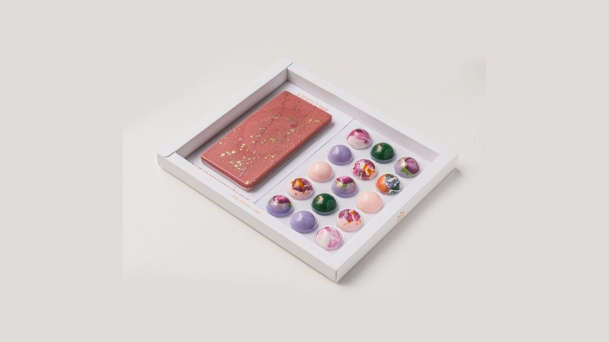Selekcija ručno pravljenih pralina u kombinaciji sa Ruby čoko tablom sa usoljenim pistaćima.