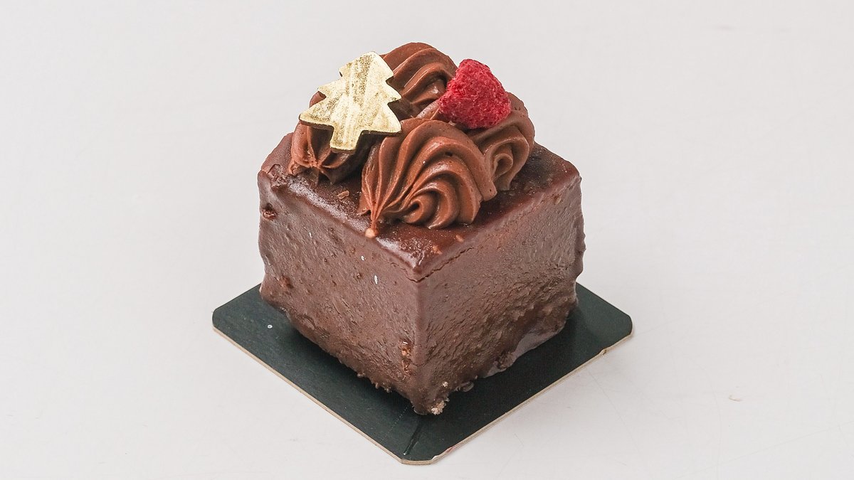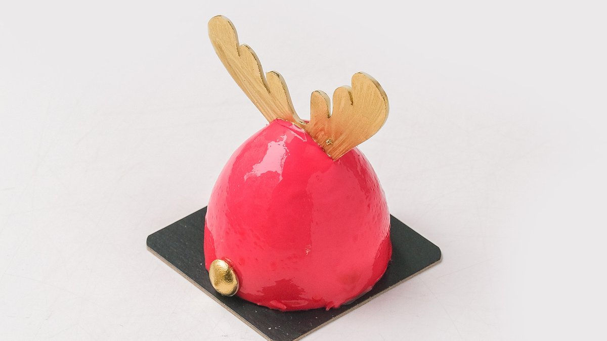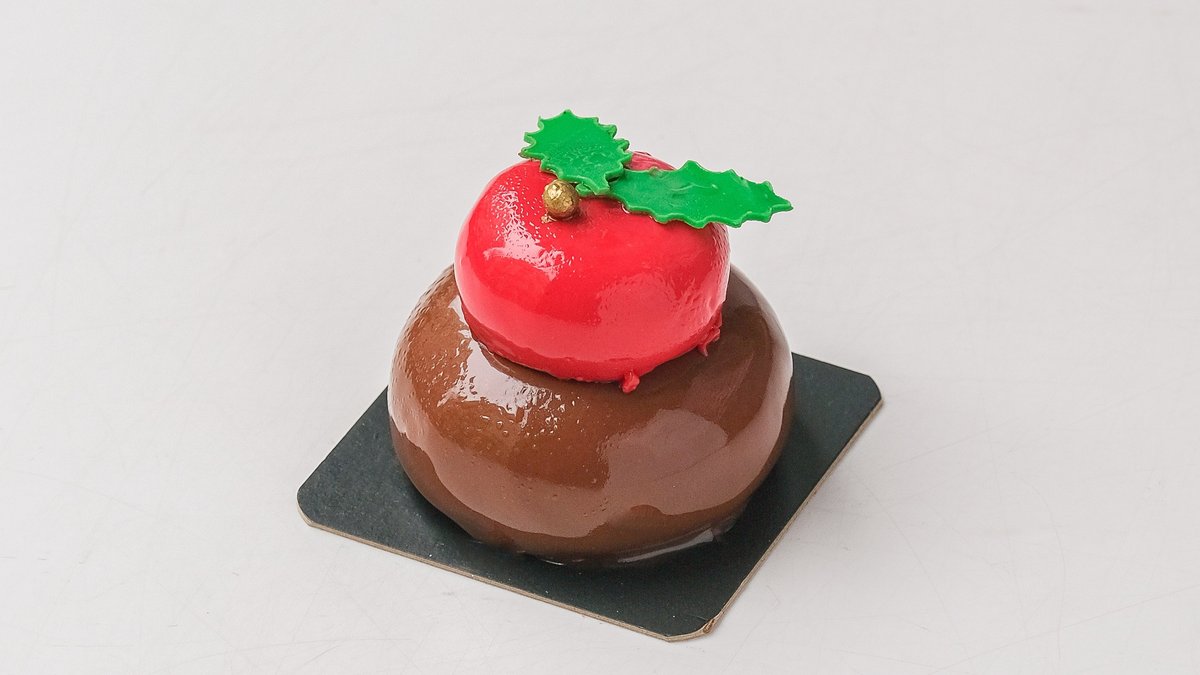 Osvežavajući mus od marakuje i manga na korici od crne čokolade, umočen u roche od mlečne čokolade i lešnika.