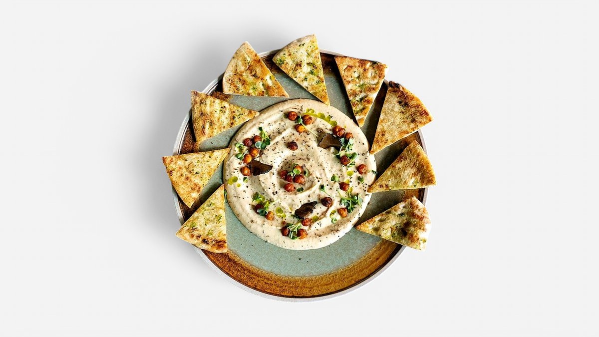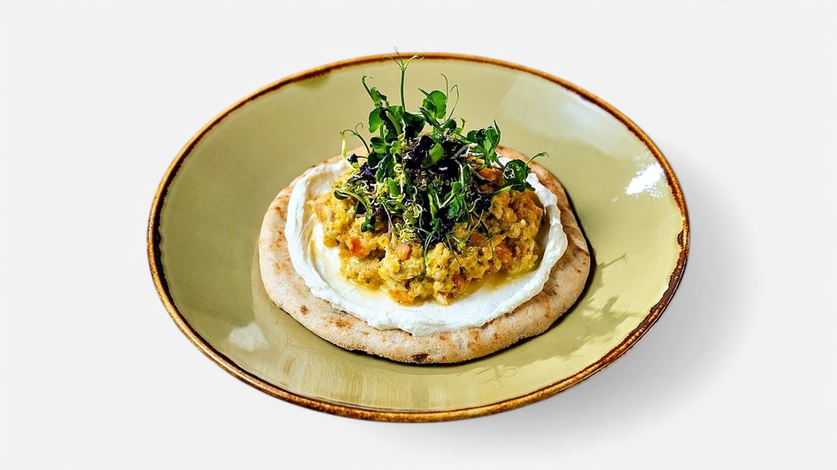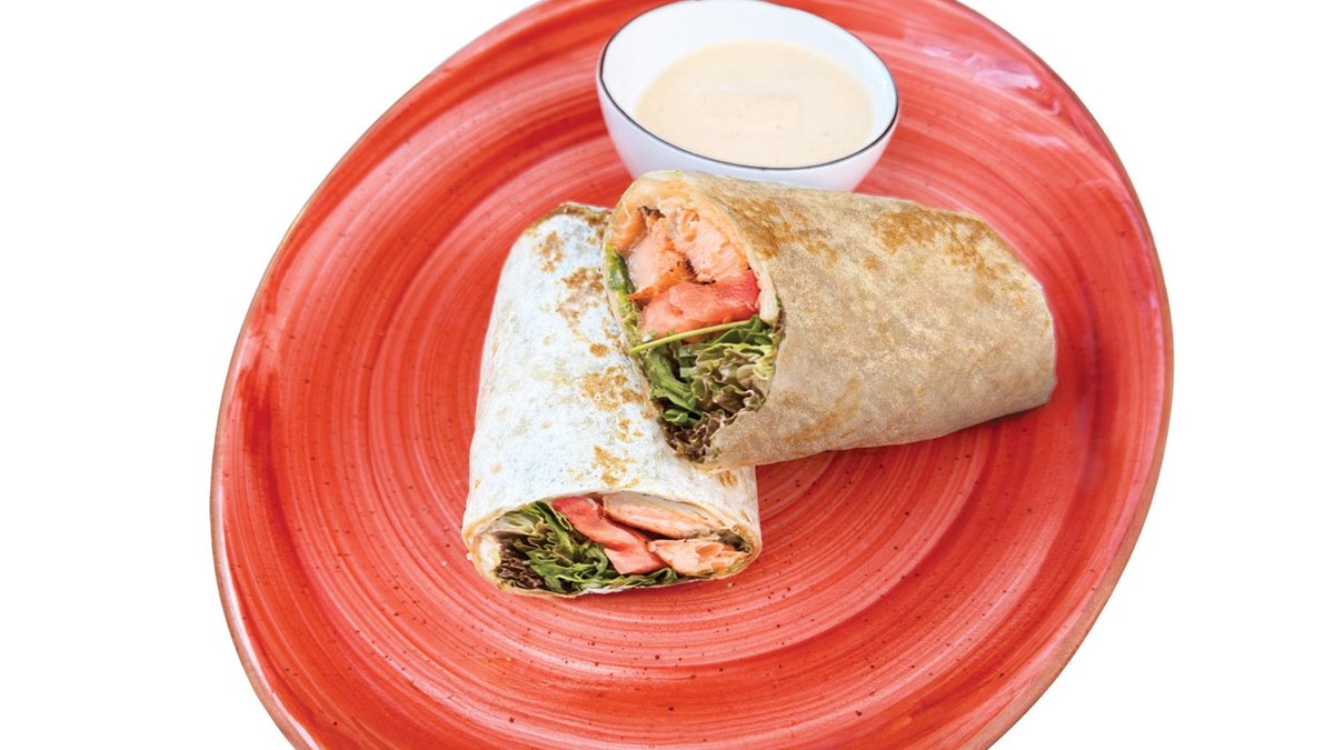 Tofu sir, brašno od leblebija, kurkuma, avokado, paradajz, matlivac, ljuti majonez, tortilja