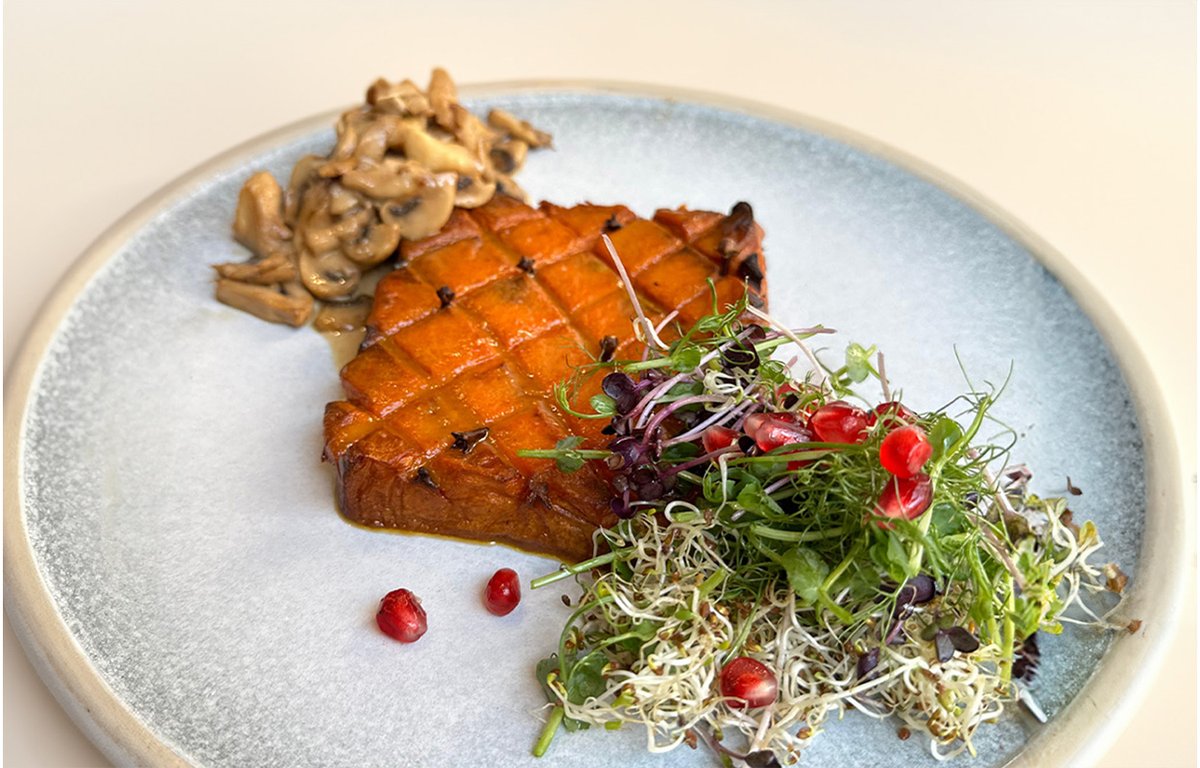 Panko prezla, pire od batata, losos, krompir, mozzarela, parmezan preliv