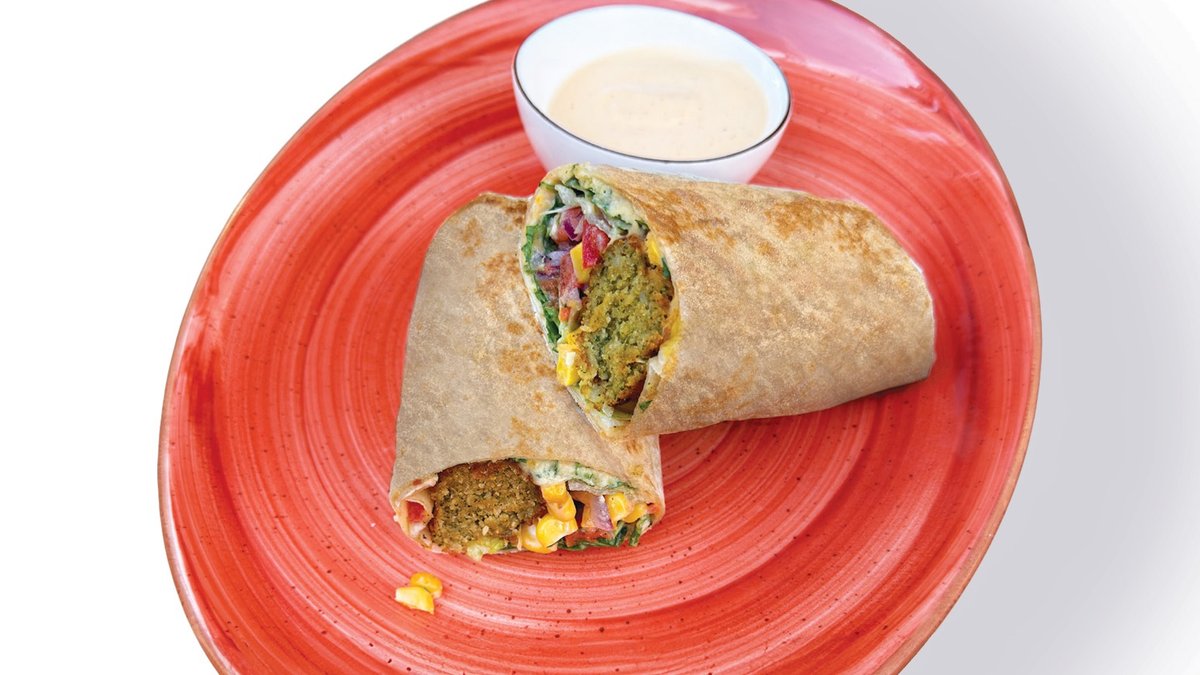 Humus, ajzberg, rukola, paradajz, kukuruz, crveni luk, peršun, limun sok, maslinovo ulje, ljuti majonez, falafel