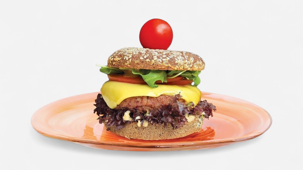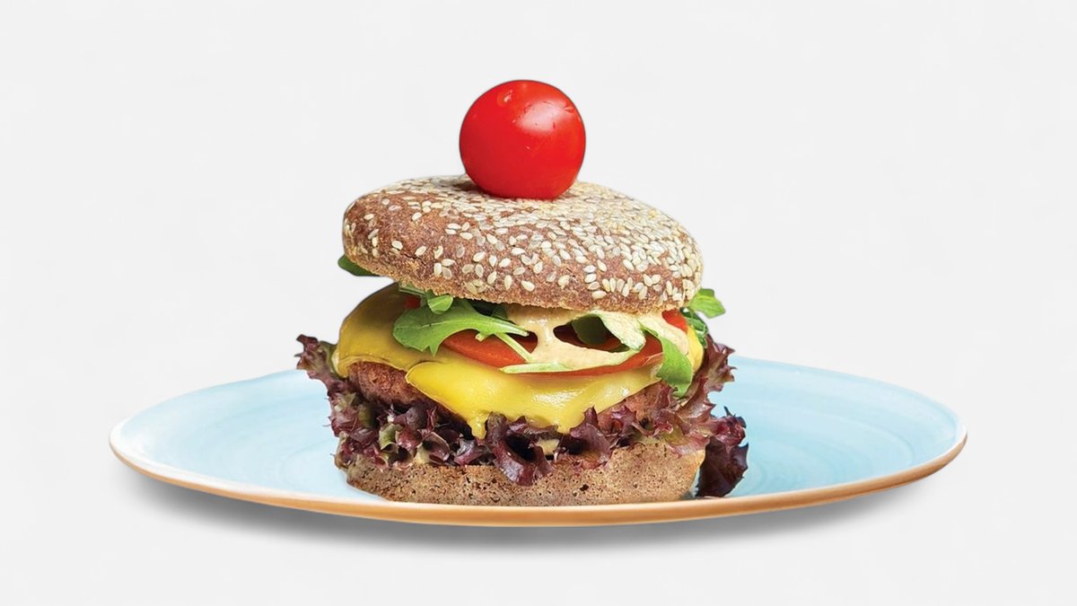 Veganski visoko proteinski dimljeni burger, zrno Ra zemička od speltinog brašna