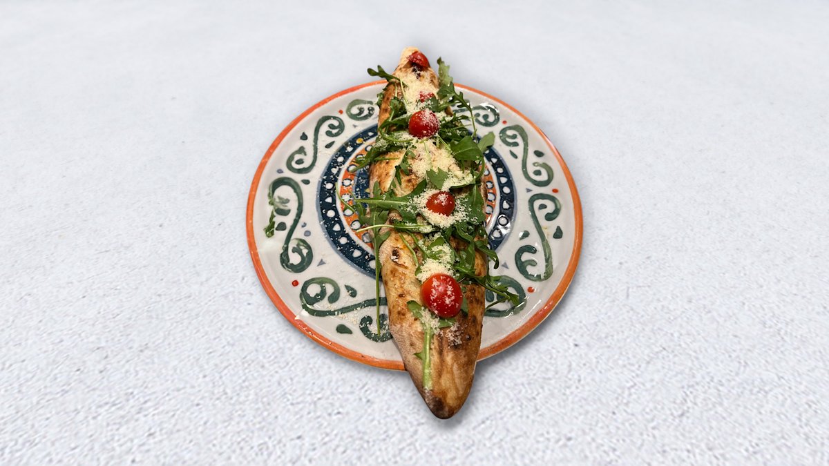 Hleb iz pica peći, pršuta, mocarela, pesto, paradajz, rukola
