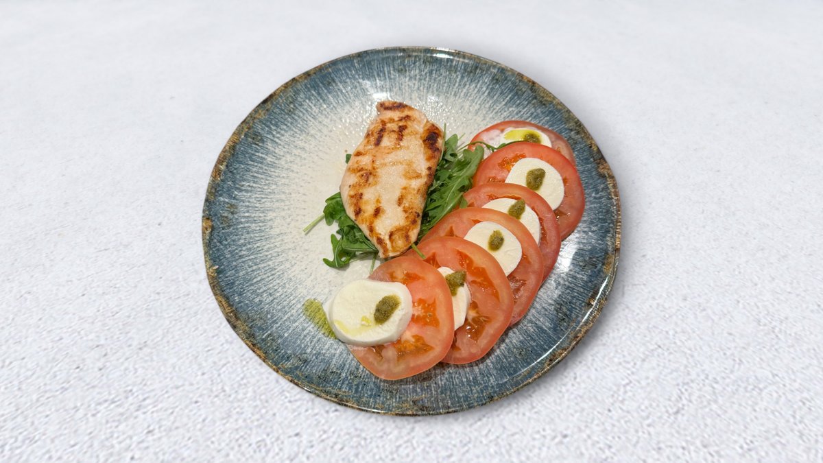 paradajz, mocarela, pesto sos, bosiljak, pileći file