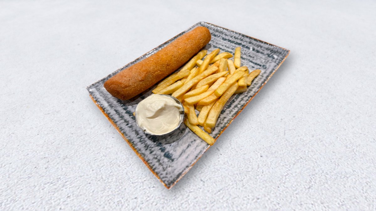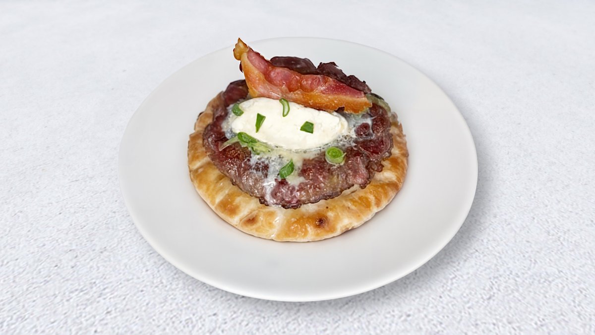 100% juneće meso sa pančetom, dimljenim sirom, kajmakom, servirano na lepinji, pomfrit