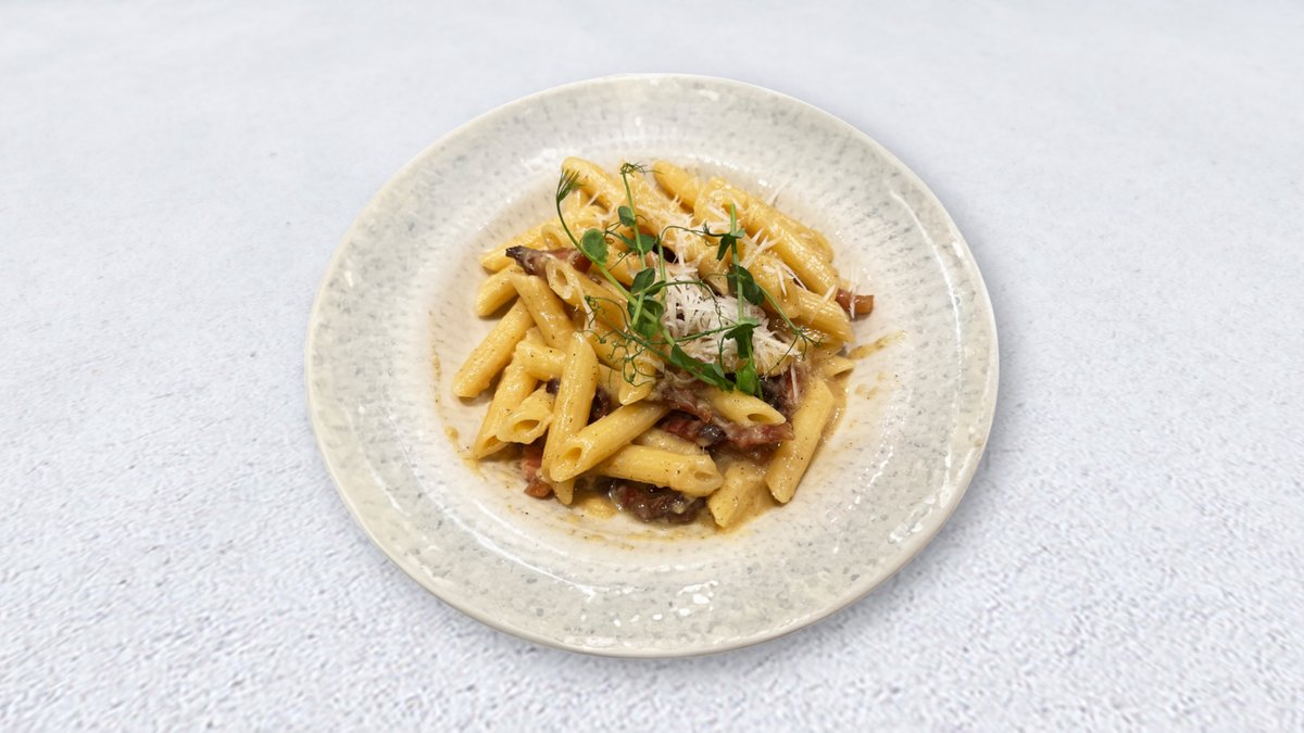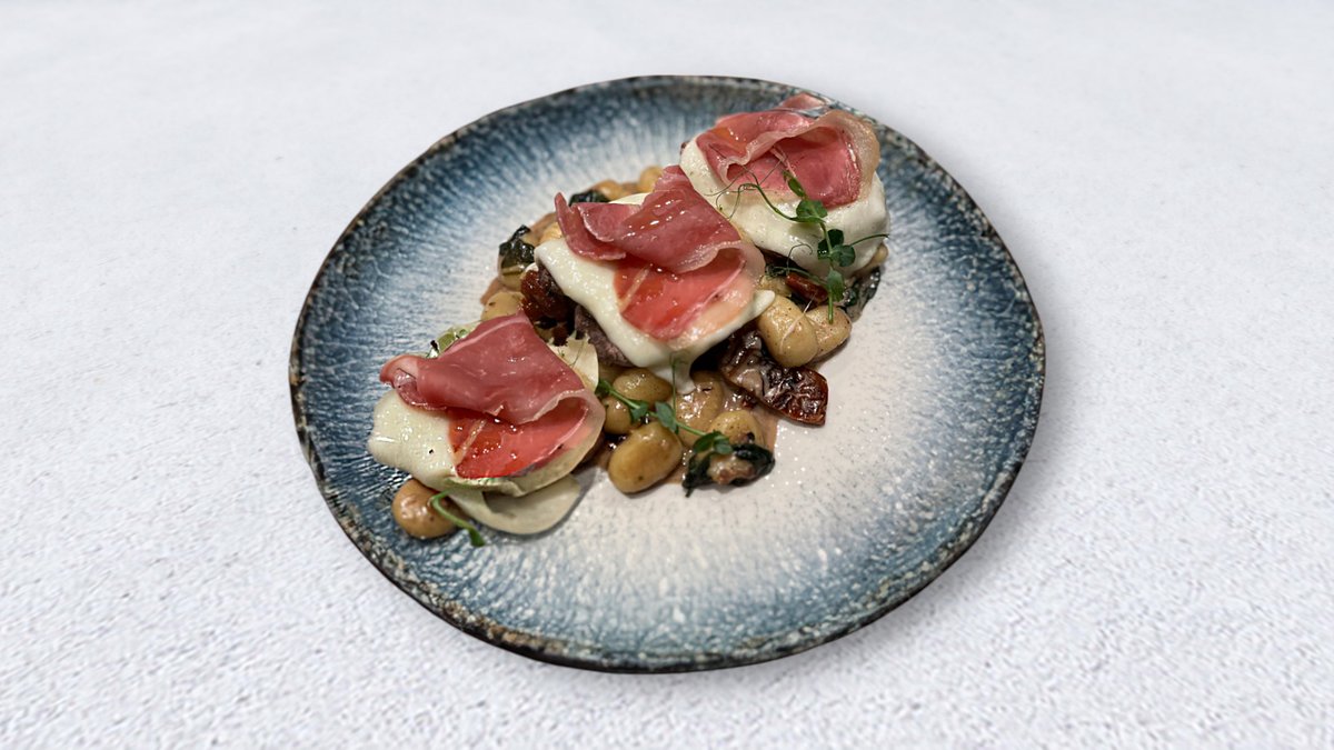 svinjski medaljoni sa pršutom i mocarelom servirani na njokama i sosom od sušenog paradajza