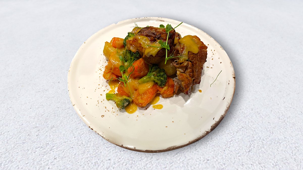 Sporo pečena teletina sa domaćim krompirom, brokolijem i šargarepom