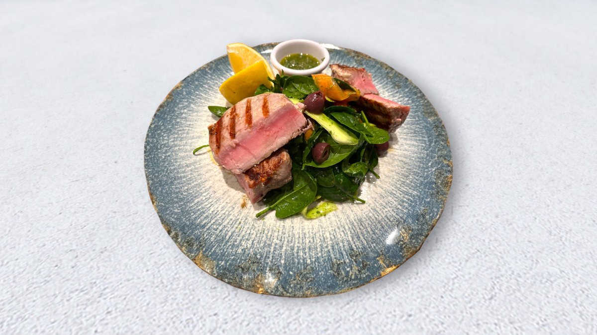 grilovana tuna 300g, baby spanać, šargarepa, čeri paradajz, kalamata masline, bosiljak