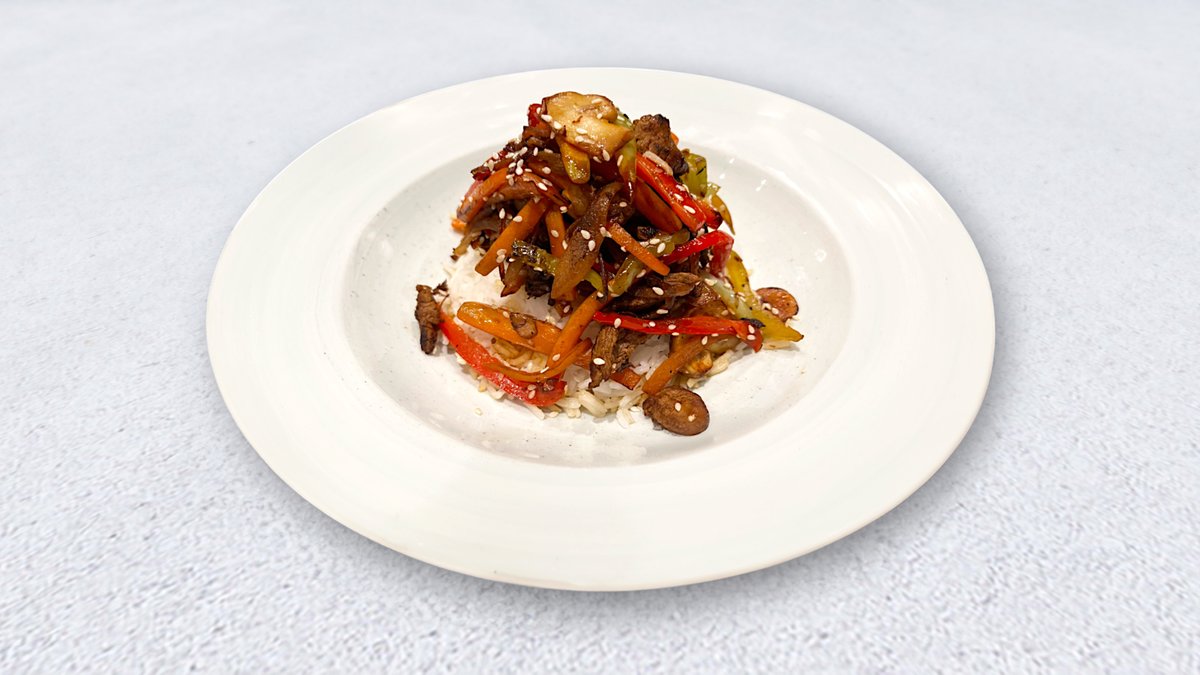 juneći biftek sečen žilijen, crni luk, crvena paprika, zelena paprika, šargarepa, šampinjoni, soja sos, susam, servirano na pirinču