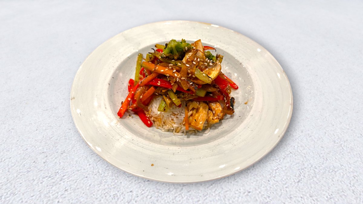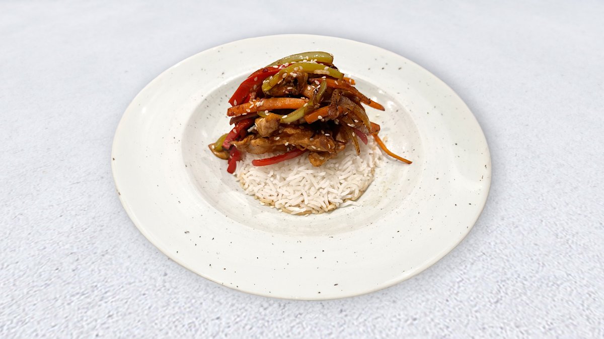 pileći file sečen žilijen, crni luk, crvena paprika, zelena paprika, šargarepa, šampinjoni, soja sos, susam, servirano na pirinču