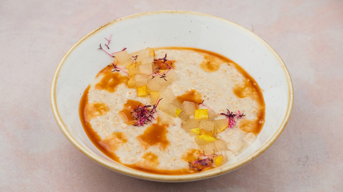 Oatmeal porridge on soy milk with salted caramel & compressed pear