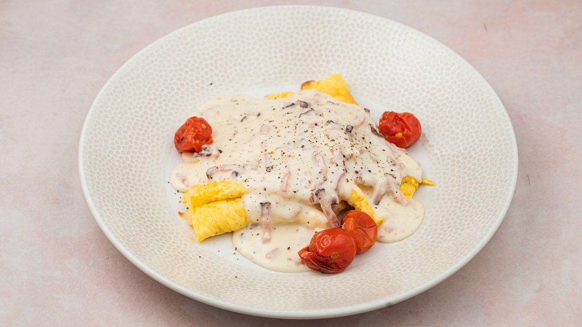 Omlette with stewed cherry tomatoes and carbonare sauce